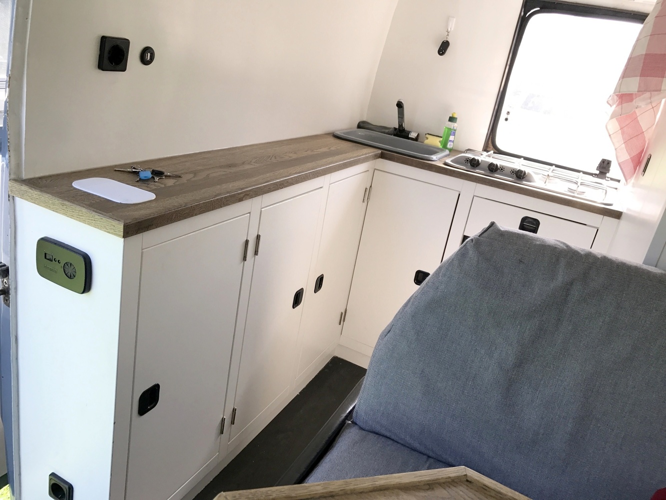 Ich bin gut gewartet und innen richtig modern: dank 110 Wp Solarpaneel, stimmungsvoller LED Innenbeleuchtung, 230V Steckdosen (Landstrom erforderlich) sowie 12V USB Steckdosen fürs Smartphone/Tablet Laden.
