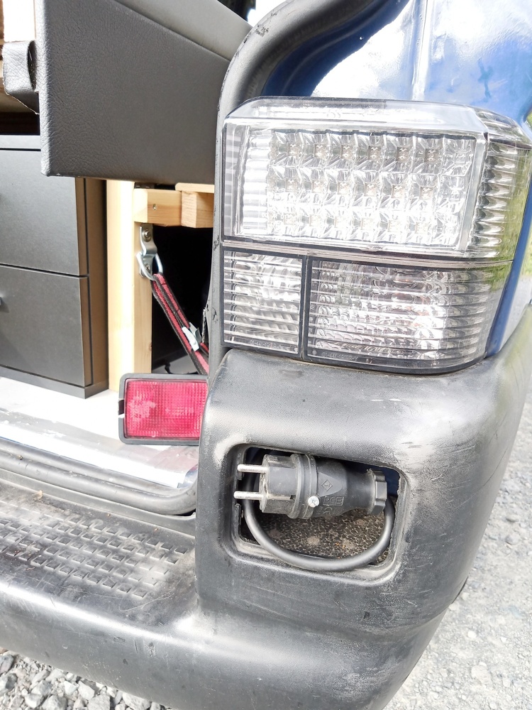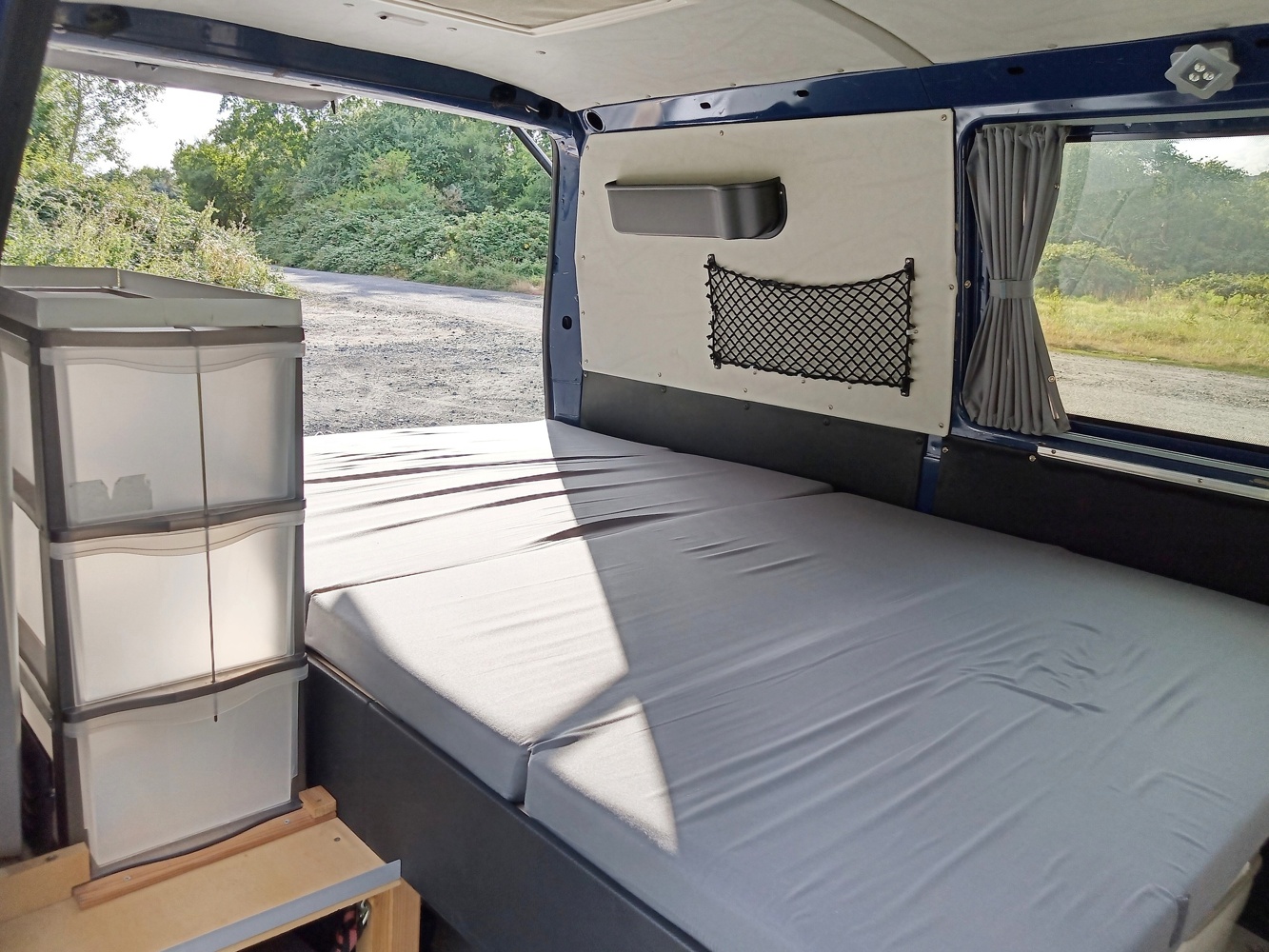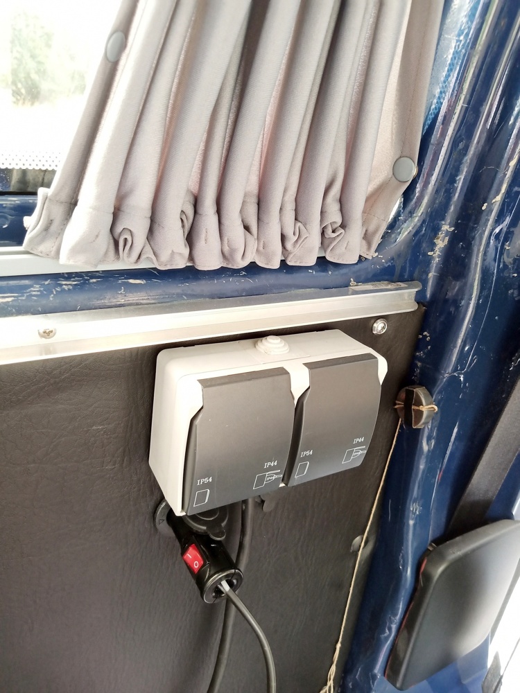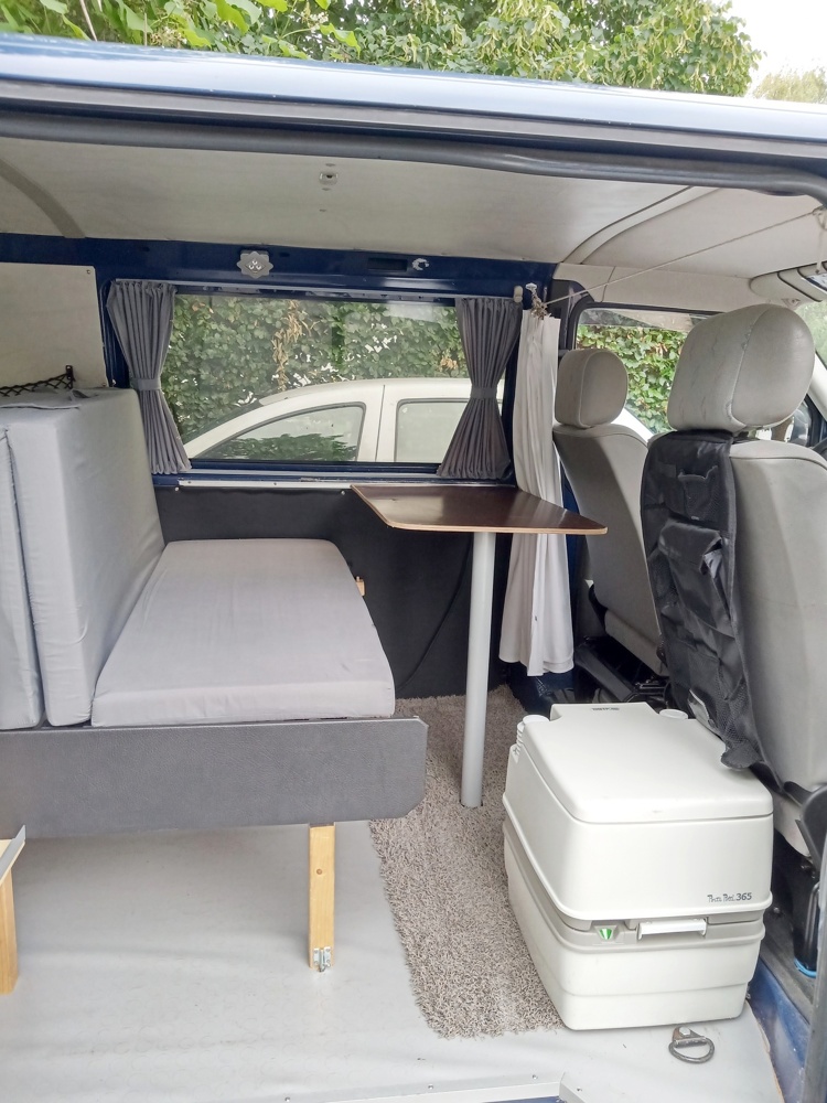Im inneren gibt es eine auf Grösse angepasstes Bett mit richtigem Lattenrost und Matratze. Es ist auch noch eine zusätzliche Sitzmöglichkeit möglich, so kann man bei Regen dann auch noch im Auto am Tisch sitzen und durch den Land-Stromanschluss oder die Versorger-Batterie die Geräte beruhigt benutzen (direkt mit USB und 12V-Zigarettenanschluss), ohne das die Starter-Batterie leer wird. Auf dem Campingplatz habt ihr dann die Möglichkeit mit dem 230V Landstrom-Anschluss, noch die vorhandenen Steckdosen im Inneren zu versorgen. So könnt Ihr auch z.B. den grossen Heizlüfter oder andere Geräte mit 230V betreiben.