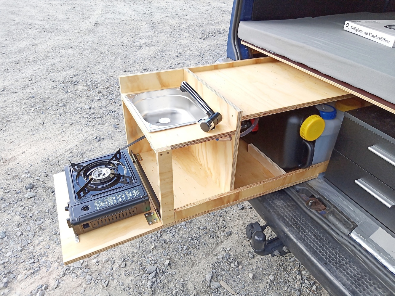 Die Küche (Kochstelle & Waschbecken) im Heck ist komplett ausgestattet mit allem, was man auch von zuhause kennt (Geschirr, Besteck, Gaskocher mit Grillaufsatz etc. ) und sind auch im Preis inklusive zur freien Nutzung. Haben dieses Jahr jetzt noch eine komplett neue Kompressor-Kühlbox gekauft, also Kühlschrank wie zu Hause, nur kleiner ;-)