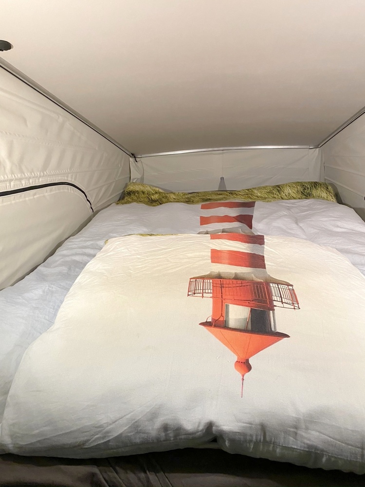 Situé au dessus du véhicule il se déplie par l'intérieur. Il permet de garder le confort d'un grand lit sans prendre de place dans le véhicule.