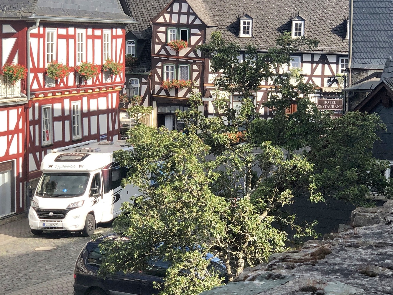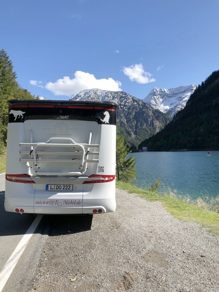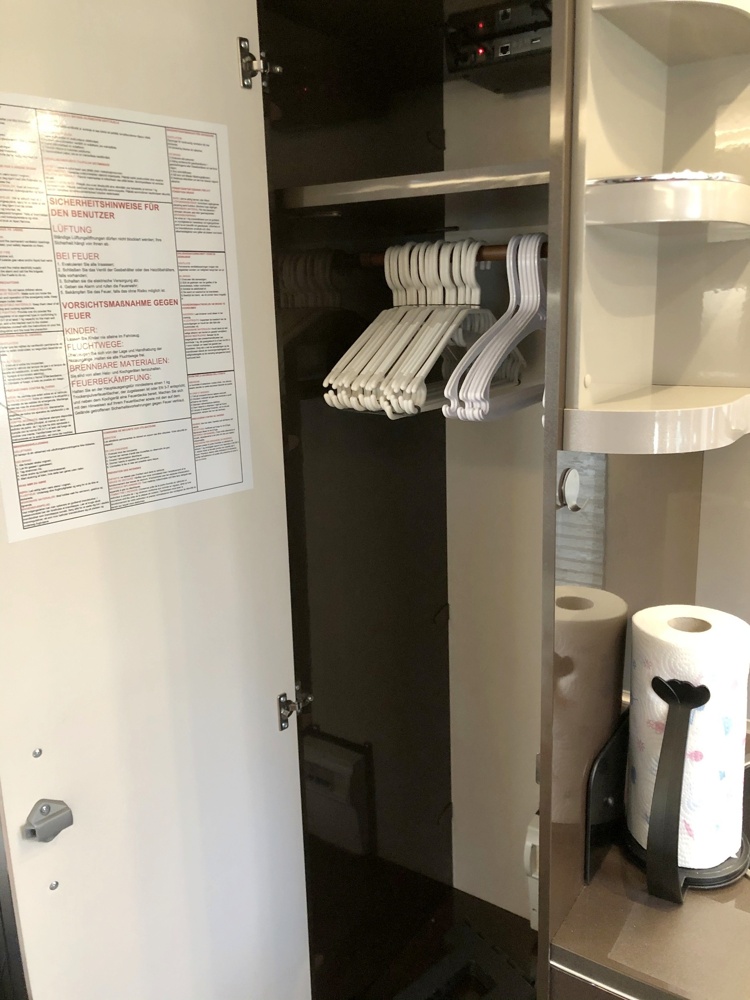 In der großen Heckgarage halten wir eine Kabeltrommel, ein 10m Elektrokabel und Adapter, einen Schlauch mit Gardena-Anschlüssen vorrätig. Dort findet sich auch der Klapptisch samt Stühlen damit man es sich draußen unter der großen Thule Markise gemütlich machen kann.