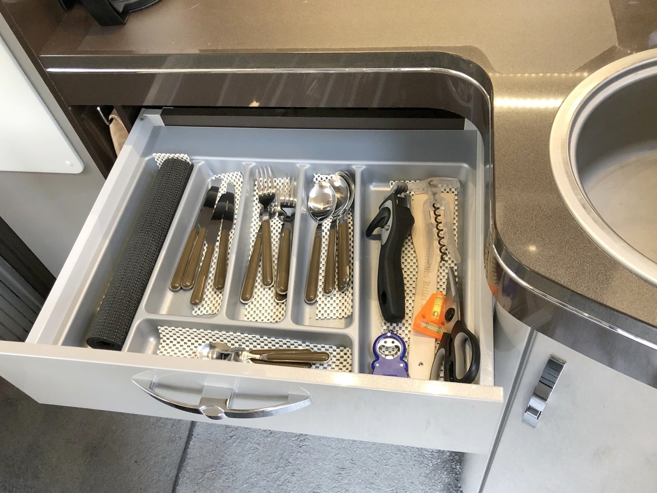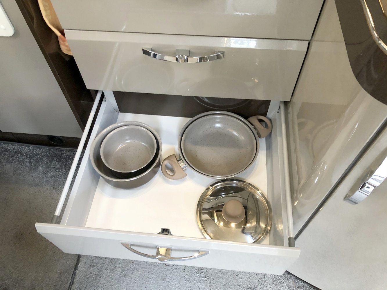 Als Besonderheit weist unser Mobil eine Hundebox unterhalb des Seitenbetts auf. Natürlich kann der Platz auch als Stauraum genutzt werden. Als weitere Ausstattung für unsere 4-beinigen Gäste sind ein Wassernapf mit Anti-Schlabberaufbau, ein Futternapf, zwei Anleinkarabiner fürs Gurtschloss, eine Anleinmöglichkeit für außen und eine Außendusche vorhanden.
