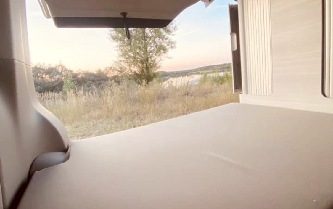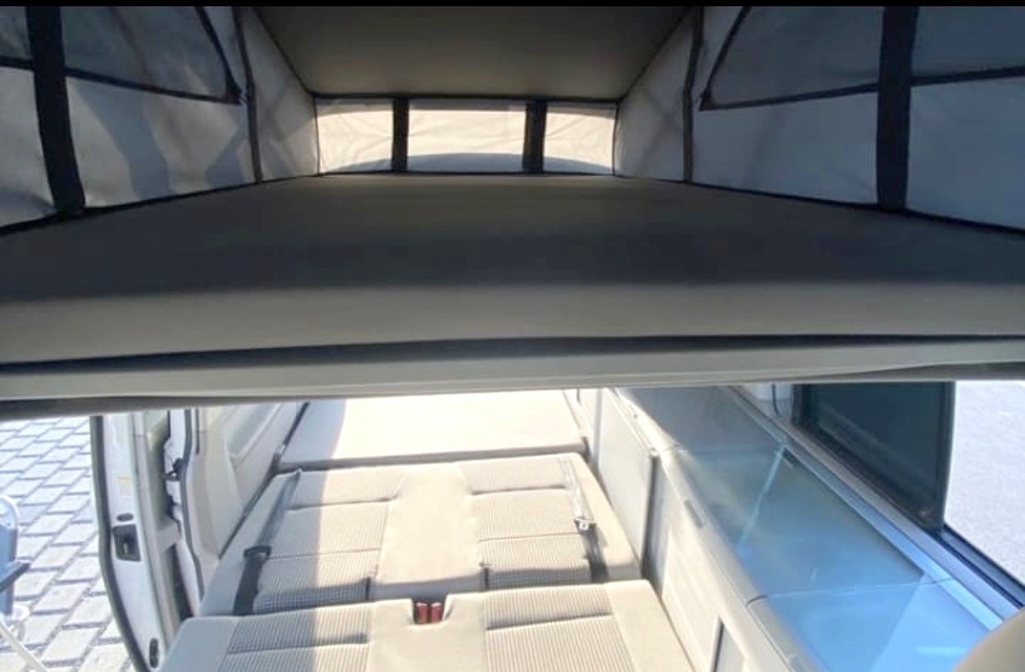 Situé au dessus du véhicule il se déplie par l'intérieur. Il permet de garder le confort d'un grand lit sans prendre de place dans le véhicule.